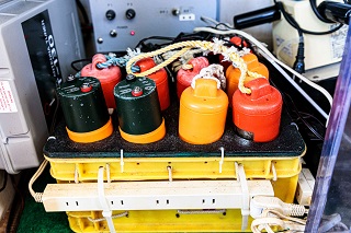 DDD03は水につかると作動し始めます。水との接触によって1~500kHzのイルカが避ける超音波振動をランダムに出し、超音波に慣れさせずにイルカを忌避する装置です。